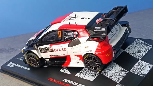 Modelo a escala 1:43 del Toyota GR Yaris Rally1 del año 2023, producido por Altaya. Esta miniatura representa uno de los autos de rally híbridos más modernos del Campeonato Mundial de Rally (WRC), con carrocería detallada, decoración original del equipo y gráficos inspirados en la unidad de carrera real