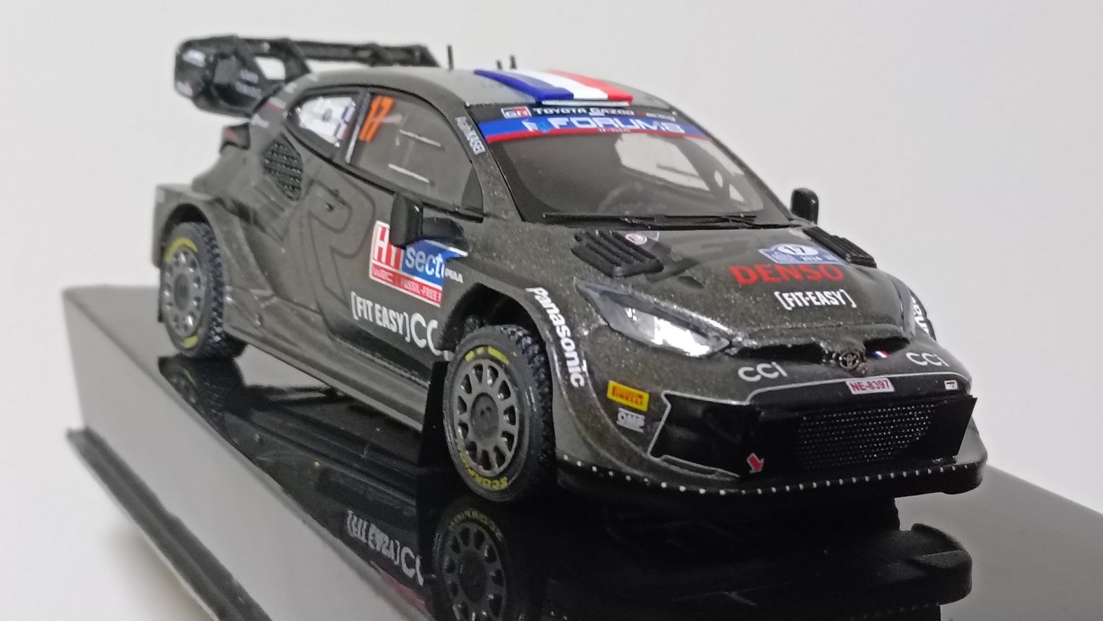 Modelo a escala del Toyota GR Yaris Rally1, auto de la era híbrida del WRC. Fabricado por IXO, con buena fidelidad en decoración y proporciones correctas para la escala 1:43. Pieza ideal para coleccionistas de rally y seguidores de Toyota en el WRC.